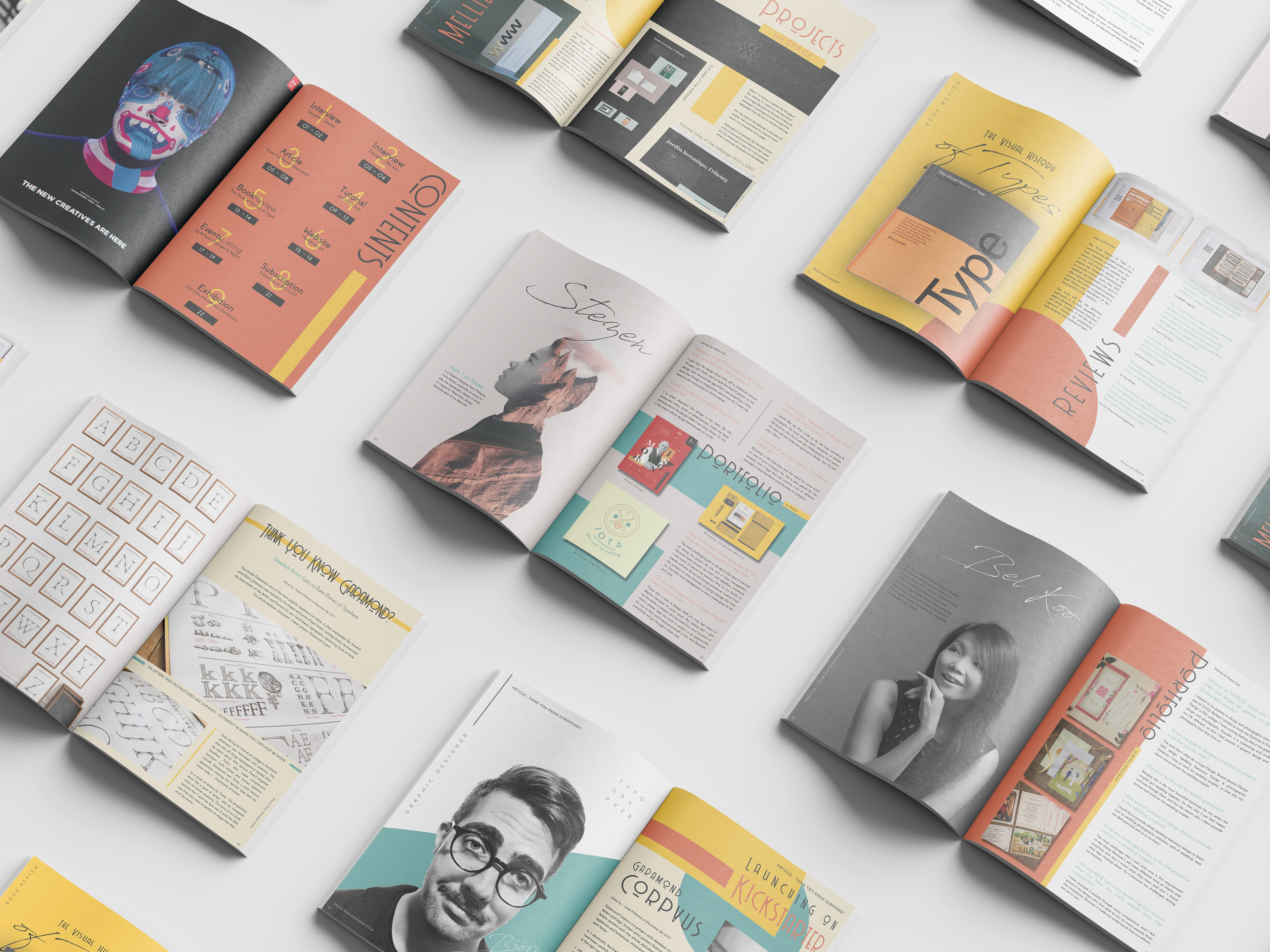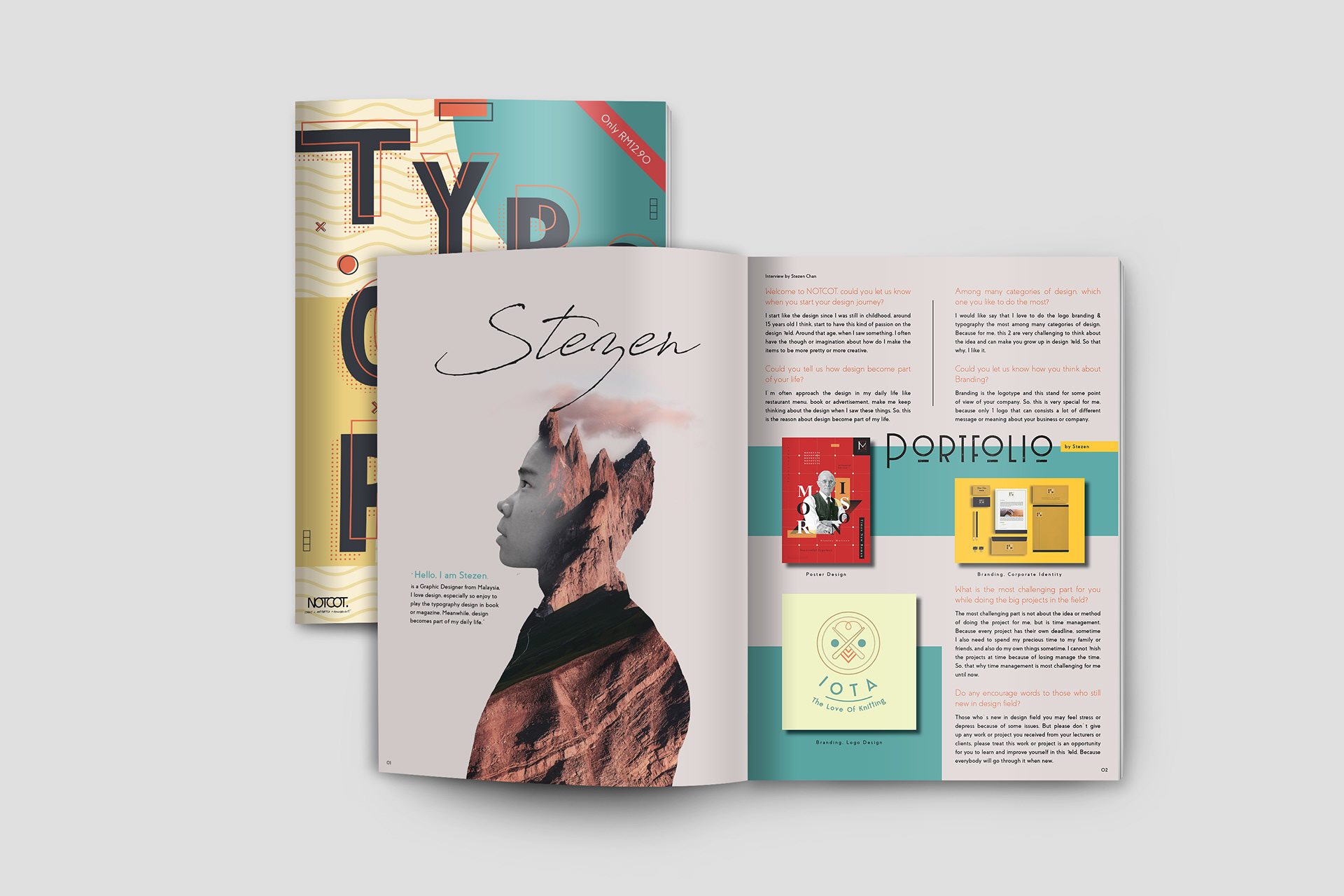 This Notcot Magazine concept project, focused on Typography, demonstrates a strong command of modern editorial and graphic design principles. The execution features a bold, layered cover that immediately signals a vibrant, design-centric publication. Inside, the layout expertly balances striking visual elements—like the compelling "Steagen" double-exposure portrait—with clear, functional content structures (portfolios, interviews, reviews). By utilizing a sophisticated color palette, dynamic hierarchy, and original artistic direction, this project successfully creates a cohesive and professional publication mock-up, highlighting skills in editorial layout, type design, visual hierarchy, and photo editing.